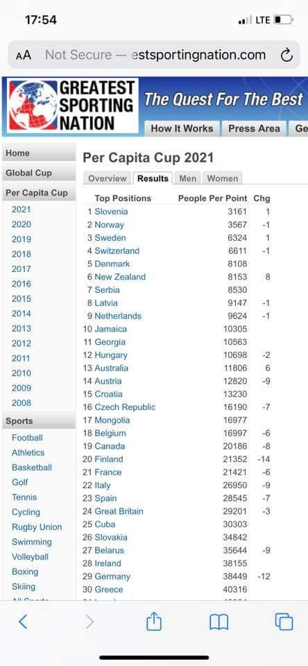 Greatest sporting nation per capita
